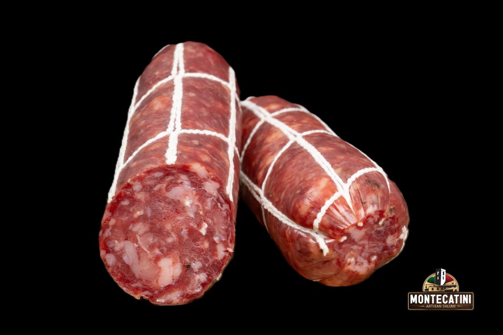 This award winning “Salame al Tartufo” is a treat for special occasions in Italy. The addition of black summer truffles with their delicate earthy aroma works magic with the all-natural pork & simple spice blend. Perfect accompanied with a strong bitey cheese and crisp dry white.